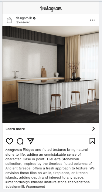 Instagram ads are targeted to engaged Design Milk social media followers, website visitors and very specific lookalike audiences. Beginning on the scheduled run date, the platform will deliver the ad to the targeted group audience. After the completion of your campaign, your Client Strategist or Sales Director will touch base with you directly with reporting.